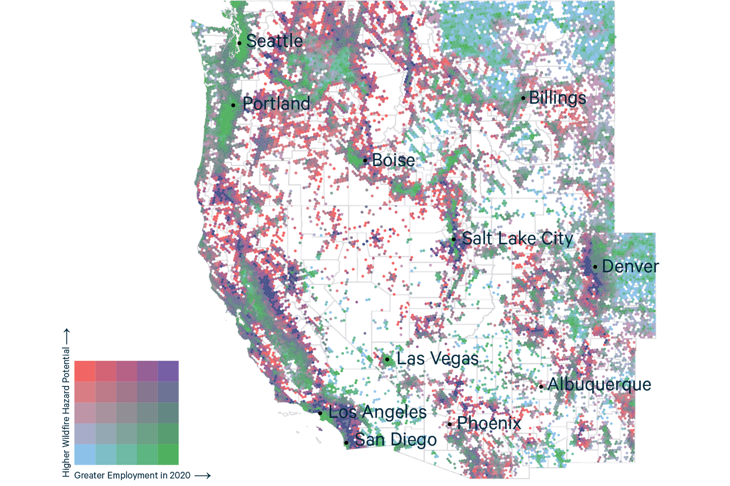 To highlight areas with many jobs and high fire hazard, Figure 1 colors each grid cell based on employment and hazard quintiles. Quintiles are bins representing a 20 percent slice of the given variable’s distribution. At the bottom left of the color legend, blue cells represent areas with the lowest 20 percent of jobs and wildfire risk (hence their concentration in places like northern Montana), while purple cells at the top right of the legend are areas with the highest 20 percent of jobs and wildfire risk. The clusters of purple cells around Los Angeles, San Diego, Salt Lake City, and Denver stand out as areas that are highly exposed to wildfire, with identifiable urban cores.