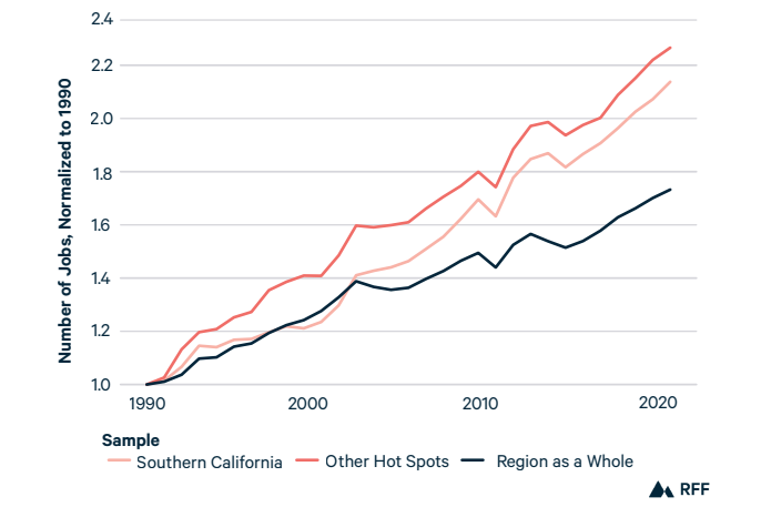 The job growth experienced in these six areas outpaces both the region as a whole and other areas of very high wildfire hazard. Compared to the overall regional job growth rate of 73 percent and the very-high-hazard growth rate of 103 percent, the number of jobs increased by 114 percent in the Southern California hot spot during the study period, and job numbers grew by 127 percent in the other five hot spots (Figure 3).