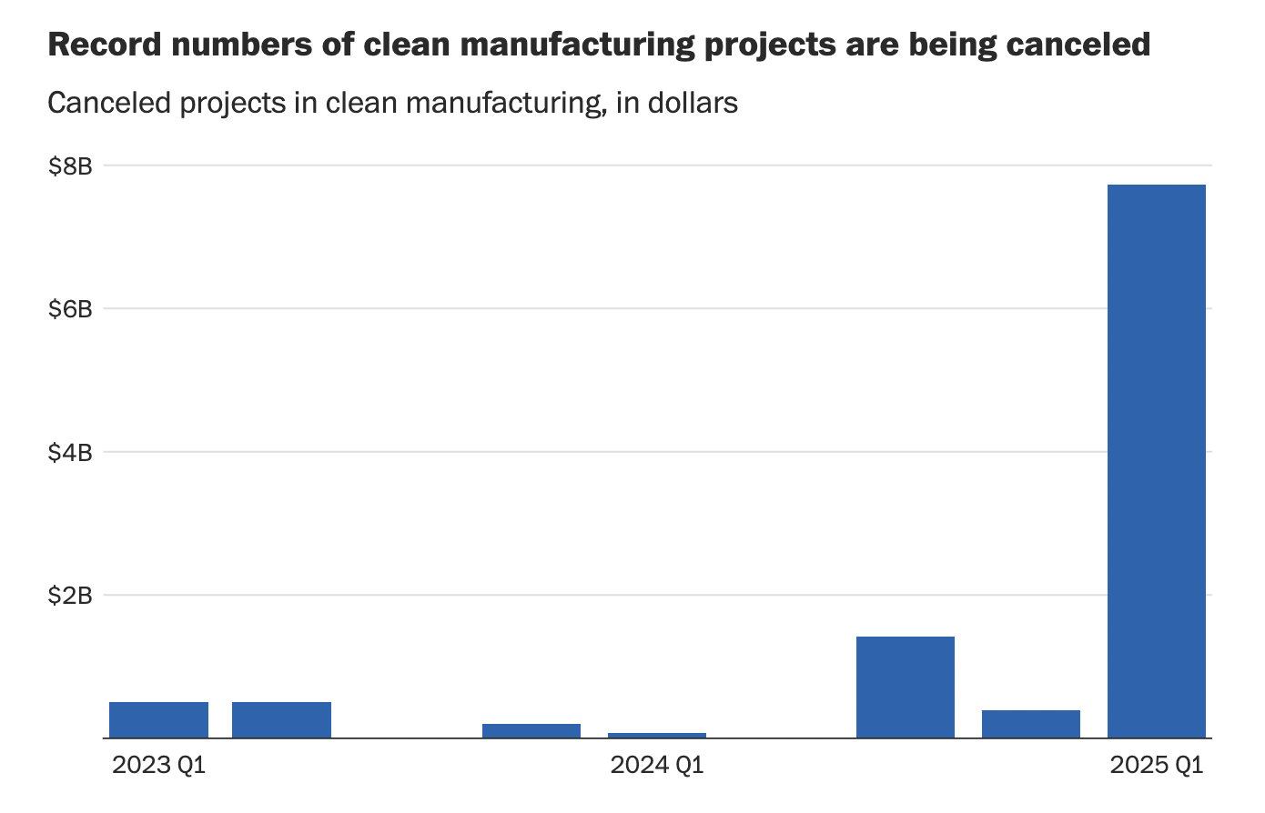 Since 2022, the Inflation Reduction Act has spurred a surge of clean energy manufacturing projects, including facilities that manufacture components of electric vehicles. But the first quarter of 2025 has seen a sharp reversal of this trend, with a wave of canceled clean energy projects totaling nearly $8 billion, according to data from the Atlas Public Policy research group. The downturn is in stark contrast to previous years and signals mounting challenges for the clean energy industry. The Trump administration’s recent imposition of tariffs on imports, such as critical minerals and lithium-ion batteries that are necessary for electric vehicles, is expected to further hinder the advancement of clean energy projects.