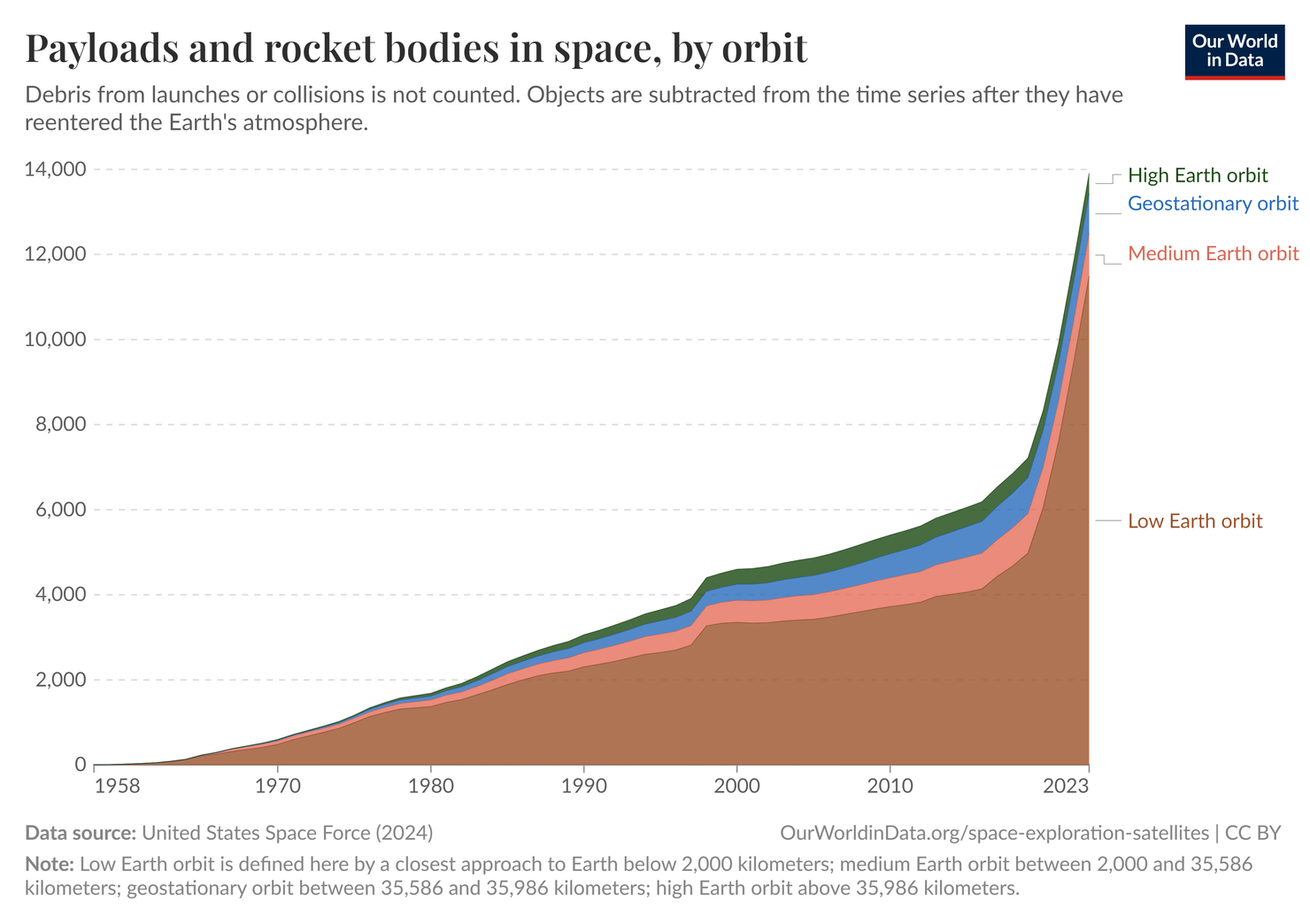 Scientists generally break down Earth’s orbit into four layers. Most satellites, rocket bodies, and debris are in low Earth orbit, the layer closest to Earth’s surface and which extends up to 2,000 kilometers into the atmosphere. This Chart of the Week shows how many payloads (i.e., instruments carried by spacecrafts) and rocket bodies are in each layer of orbit and how much those numbers have increased since 1958.