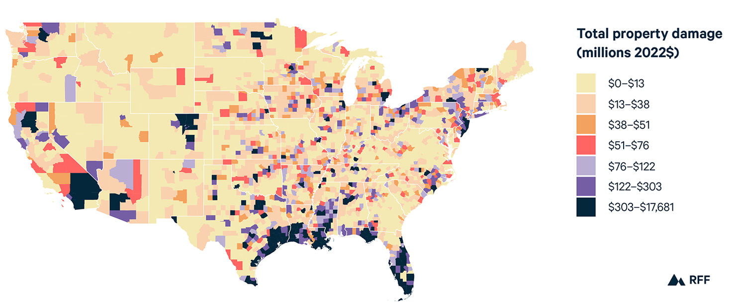 Property damage from extreme events across all counties in the United States averaged $109.7 million for this 28-year period, or $3.9 million per year per county (2022$). (For context, the average value of all residential properties in a county in the United States in 2020 combined was about $11 billion.) However, the variance in damage across counties is high. Counties in the top 10th percentile experienced $914.7 million of damage on average, while counties in the bottom 10th percentile experienced only $430,000 of damage.