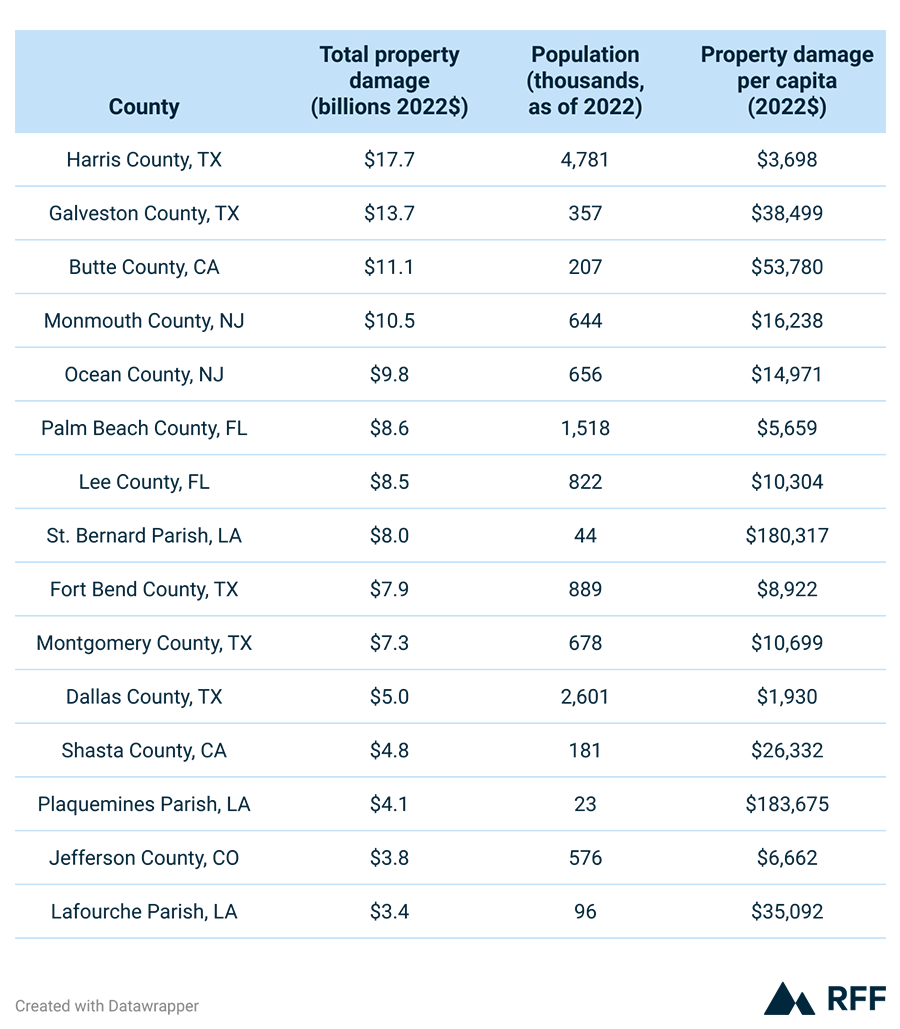 In contrast, two Louisiana parishes (the equivalent of counties)—St. Bernard and Plaquemines—have low populations and thus very high damage per capita. The average damage in Plaquemines of $183,675 per capita is 50 times greater than the damage per capita in Harris County, Texas, which tops the list for total damage.